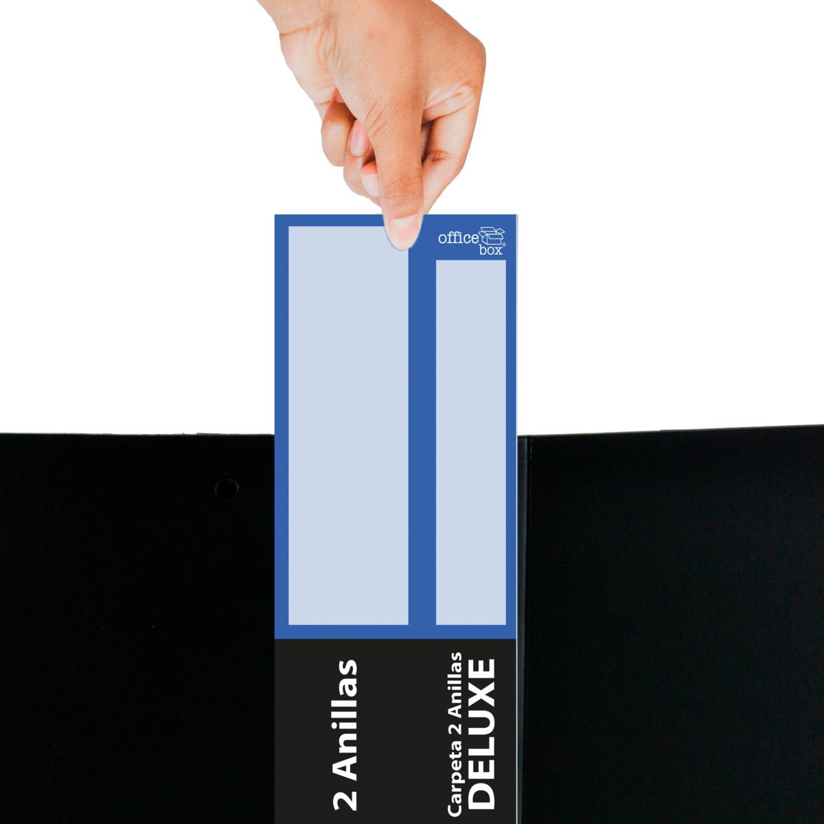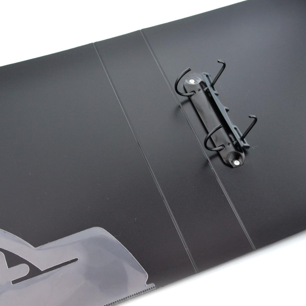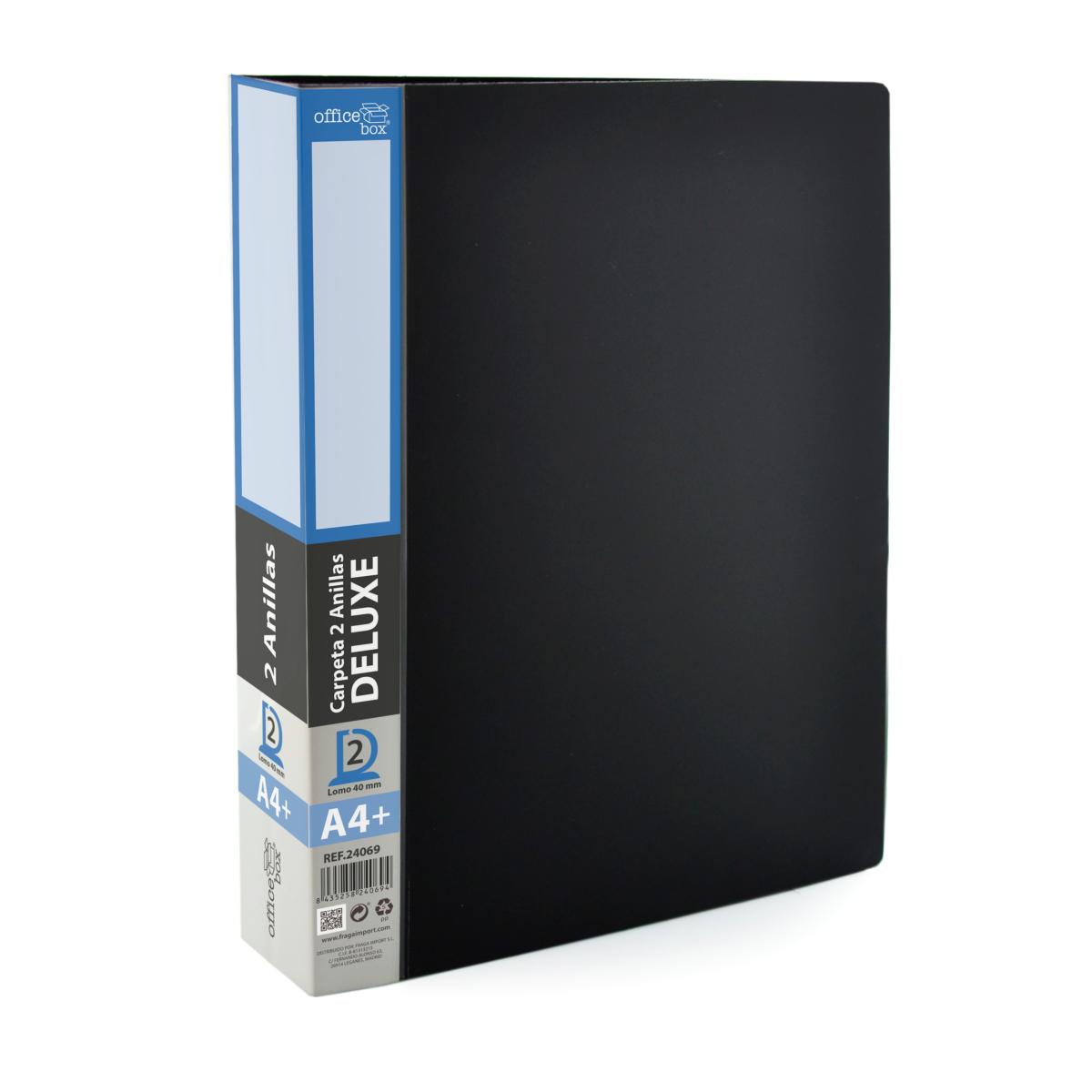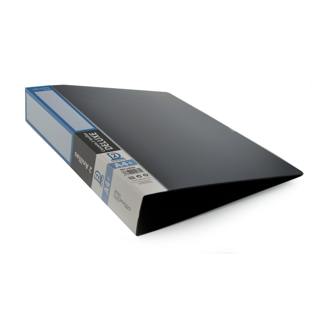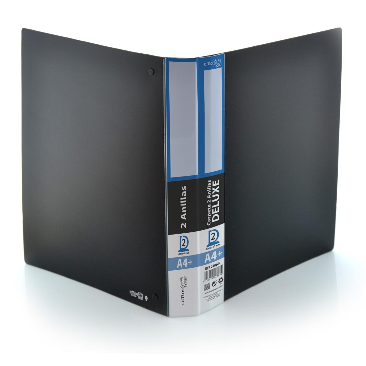 · 2 Anillas 40 mm. en "D" esmaltadas en color negro. · Con compresor de hojas y lomo personalizable. · Tapas extra rígidas. · Bolsillo interior con troquelado para CD/tarjeta. · Formato A4+ Medidas 40 mm: 320 x 265 x 60 mm.